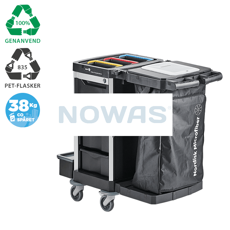 Miljøbevidst, stilren og brugervenlig rengøringsvogn i NMFs eksklusive designlinje oplagt til synlig rengøring. Solid vogn med en bæreevne på 300 kg, som kører ubesværet over gulvet. Ergonomisk vogn med 180° justerbart kørehåndtag. Konstruktion af aluminium og 2-lags plast med en levetid på min. 10 år. Fleksibel rengøringsvogn, kan ombygges efter behov on-site.