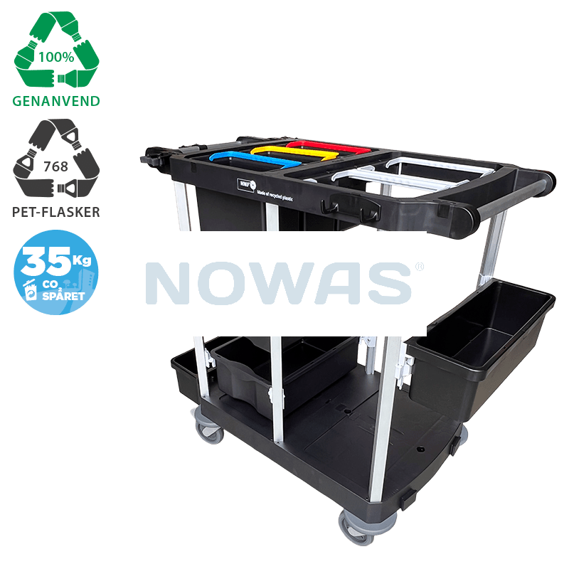 Miljøbevidst, stilren og brugervenlig rengøringsvogn i eksklusiv designlinje. Solid vogn med en bæreevne på 300 kg. Kører ubesværet over gulvet. Ergonomisk vogn med 180° justerbart kørehåndtag. Konstruktion af aluminium og 2-lags plast med en levetid på +10 år. Fleksibel rengøringsvogn, kan ombygges efter behov.