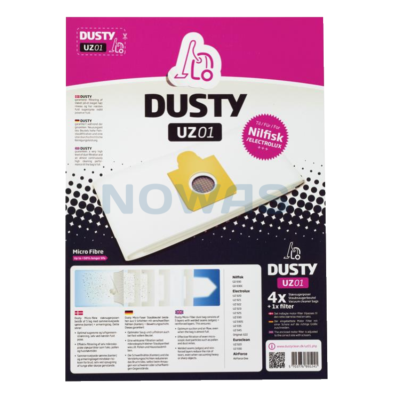 Dusty støvsugerposen i micorfiber består af 5 lag fiber. Posen har sammensvejsede kanter og et armeringslag hvilket sikrer optimal sugeevne og luftgennemstrømning, selv når posen næsten er fuld. Posen har en effektiv filtrering af selv mikroskopiske støvpartikler som fx pollen og husstøvmider. De sammensvejsede kanter og armeringslaget mindsker riskikoen for brug, selv ved opsugning af tunge eller skarpe genstande.