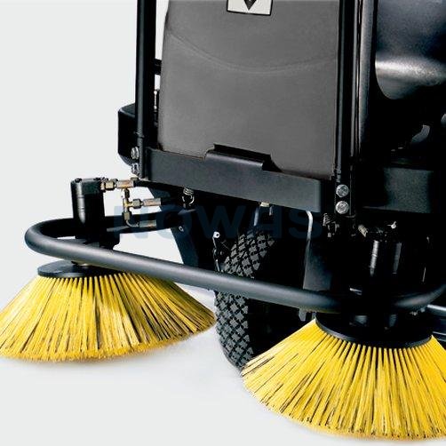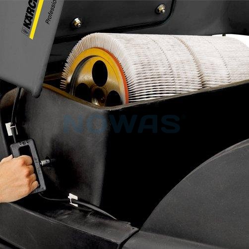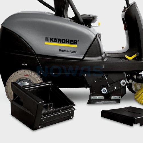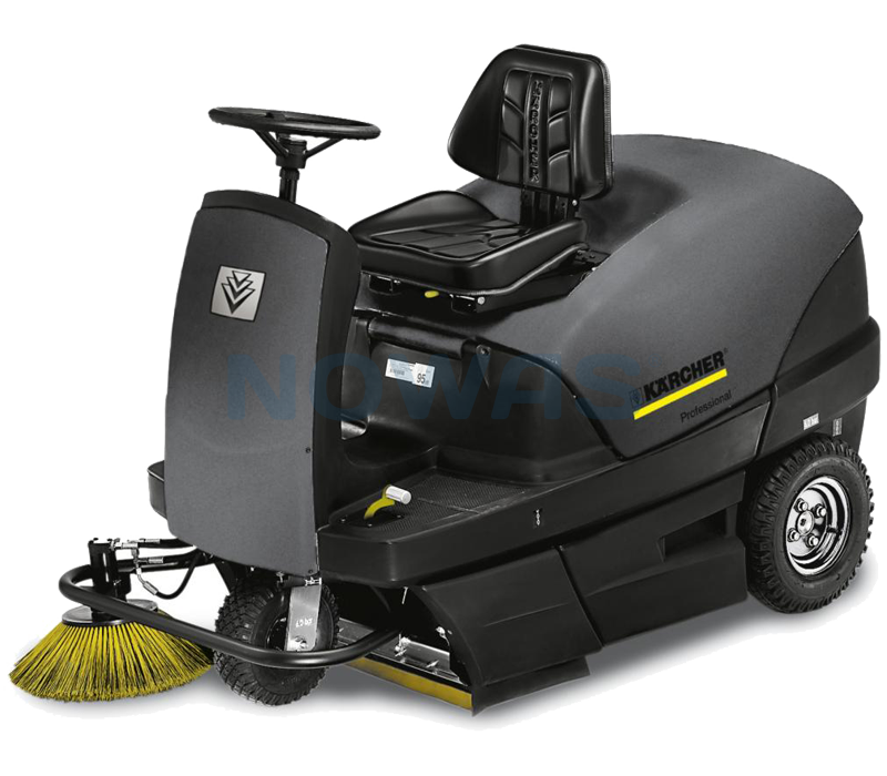 Komfortabel og moderne ride-on fejemaskine til erhvervsmæssig brug indendørs og udendørs. Til områder mellem 6.000 og 7.800 m²/t. Sidebørste og hovedvalse sænkes/løftes ved betjening af en kontakt. Fremad-/baglænskørsel reguleres via en enkelt pedal.Inklusive batterier og oplader. Begge 50 l snavsbeholdere kan tages ud fra siden. Maskinen arbejder efter overthrow-princippet, dvs. snavset kastes over valsen bagud i snavsbeholderen. Fejevalsen er pendulophængt og tilpasser sig automatisk evt. ujævnheder i overfladen. Både filter og hovedbørstevalse kan udskiftes uden brug af værktøj. Den indbyggede grovsmudsopsamler optager grovsmuds som dåser, glasskår, grus og vådt løv. Sidebørste og hovedbørstevalse drives hydraulisk. En ekstra sidebørste fås på forespørgsel.