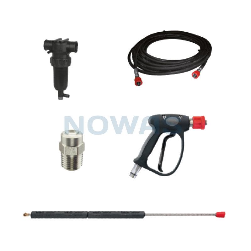 Højtryksrenseren bliver leveret med standardtilbehør, som er triggerhåndtag, lanserør, spraydyse, højtryksslange og et selvrensende filter.