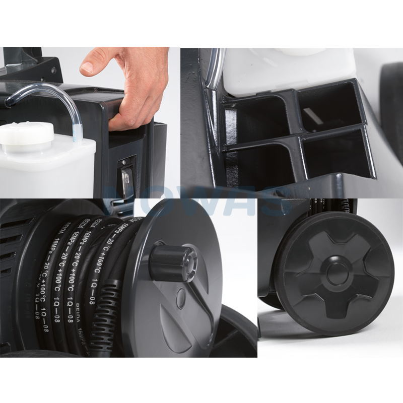 Slangerullen er placeret i bunden af højtryksrenseren. Det garanterer enestående stabilitet også når den er i brug. Ergonomisk håndtag til let manøvredygtighed.
