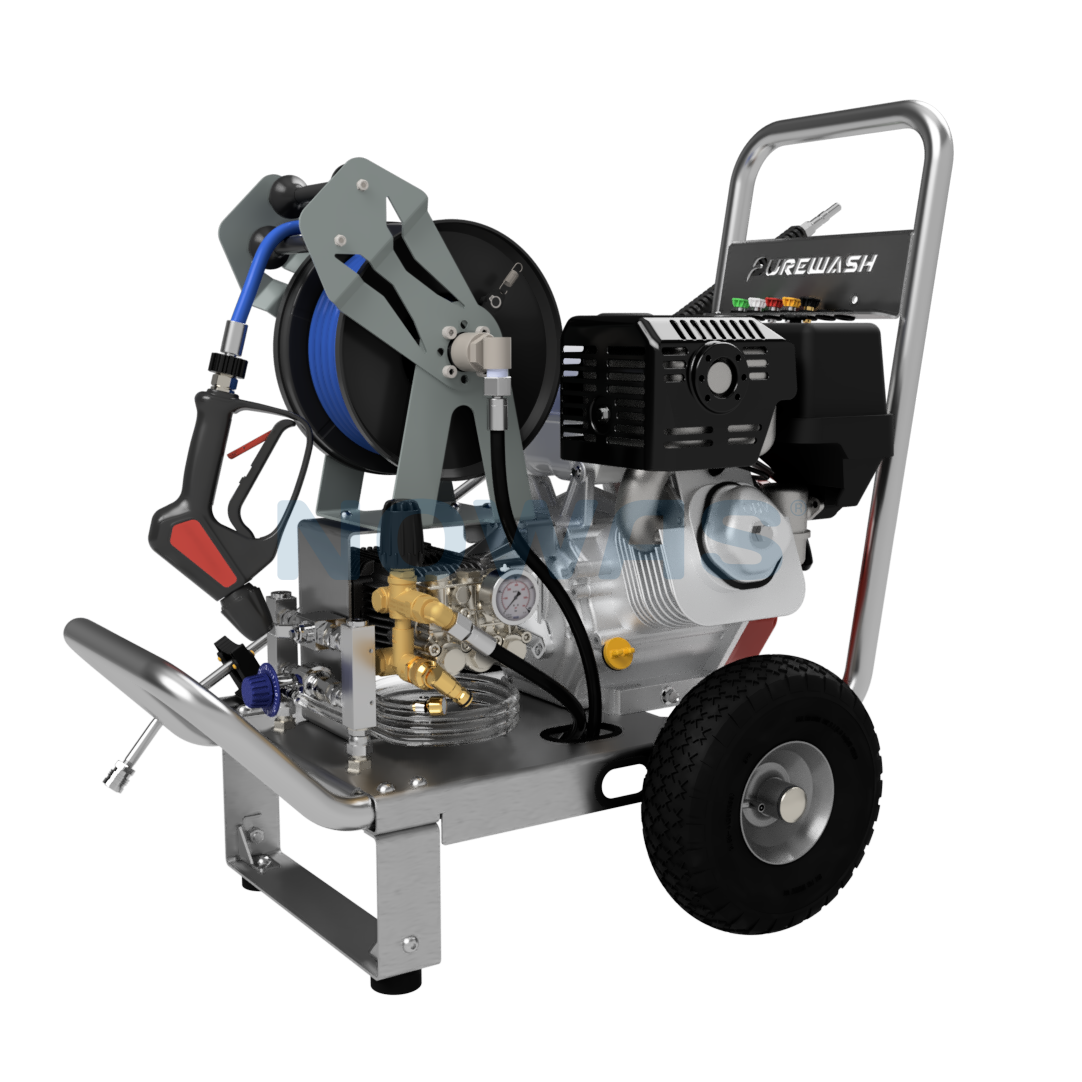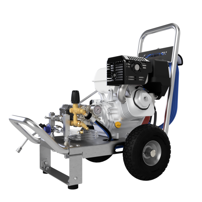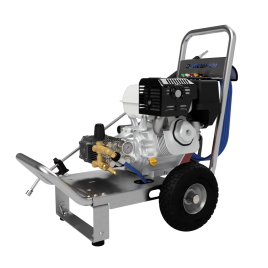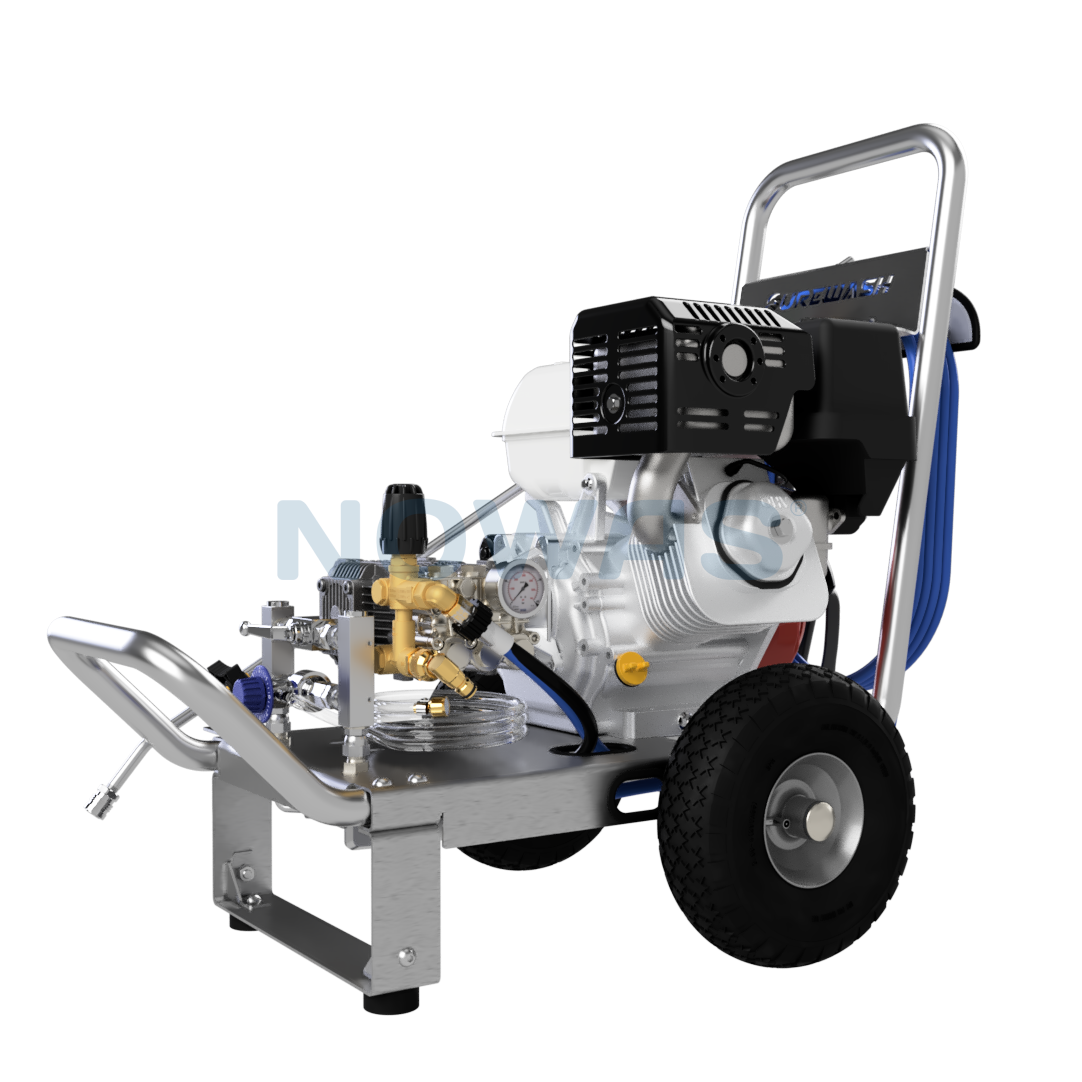 Kraftig benzindrevet højtryks trolley udviklet til professionel og industriel rengøring. Maskinen er udstyret med 4-takt motor med rekylstart og kan anvendes overalt, hvor der er adgang til vand – helt uden behov for elektrisk tilslutning. Den er opbygget på en solid trolley i rustfrit stål og kombinerer robuste benzinmotorer med en professionel Annovi Reverberi højtrykspumpe med keramiske stempler, hvilket sikrer høj driftssikkerhed, lang levetid og stabil ydelse ved krævende opgaver.
