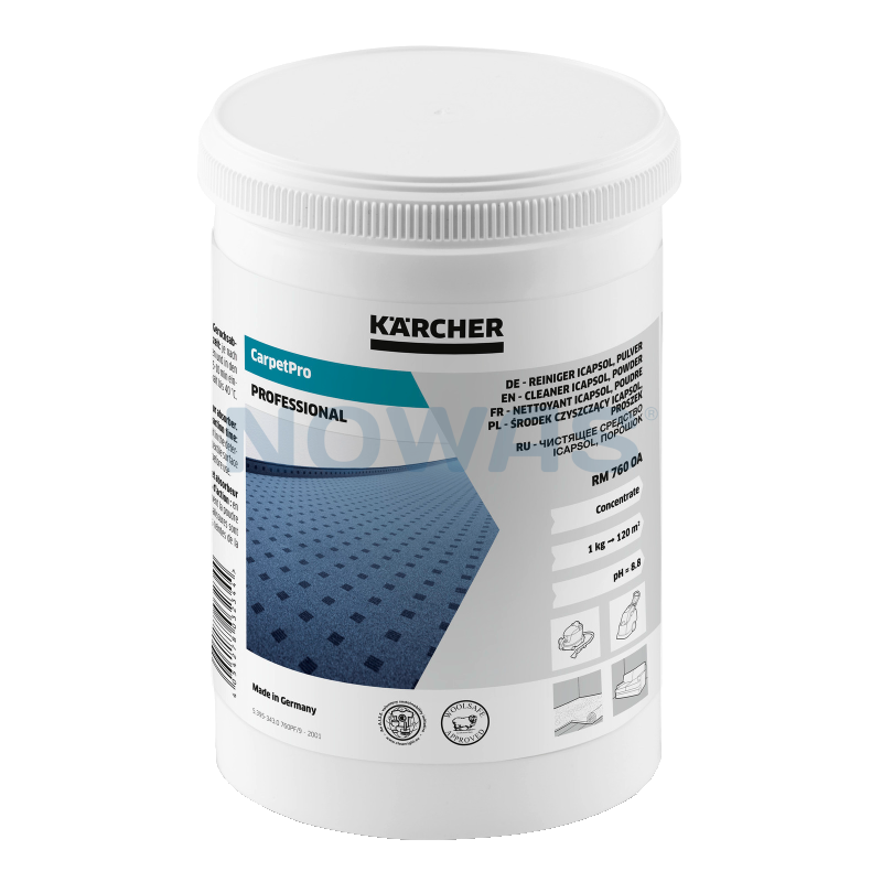 Lugtabsorberende CarpetPro rengøringsmiddel iCapsol RM 760 fra Kärcher i pulverform. CarpetPro giver en fremragende rengøringsydeevne.