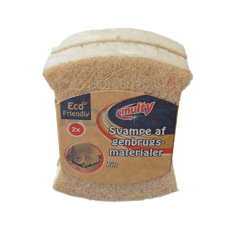 Eco køkkensvampen er en meget miljøvenlig svamp, med skum som er lavet 100% genbrugsmaterier. Skurersvampen er velegnet til rengøring af overflader der ikke tåler kraftig skuring. De brune skurefibre består af 55% genbrugsmaterialer, som f.eks indebærer frugtskaller, PET-flasker og textil. Skurerfibrene er meget fine, og derfor velegnet til snavset overflader, uden at ridse eller ødelægge overfladen.