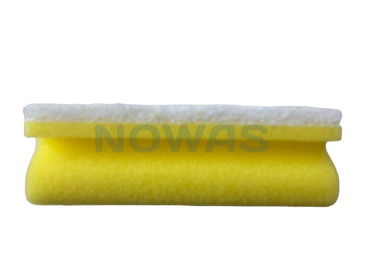 Stor skuresvamp med håndgreb.Mål: 13 x 7 x 4,5 cm.Polyestersvamp med hvid skureside i nylon.Tåler stærk syre og base.