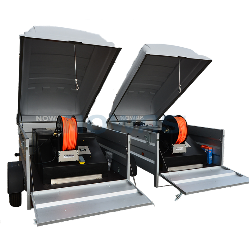 Denne trailer er tilgængelig både med og uden RO Rentvandsproduktion, hvilket betyder at den kan tilpasses den enkelte brugers behov. Vaskeanlægget i traileren bliver leveret med en Digital flowcontroller og 100 mtr. 8 mm. Safety first vandslange, en 450 ltr. tank og et elektrisk slangehjul som standard udstyr.