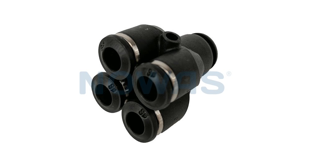 Push-fit adapter der reducerer fra 8 mm til 6 mm. Adapteren har 4 udgange.