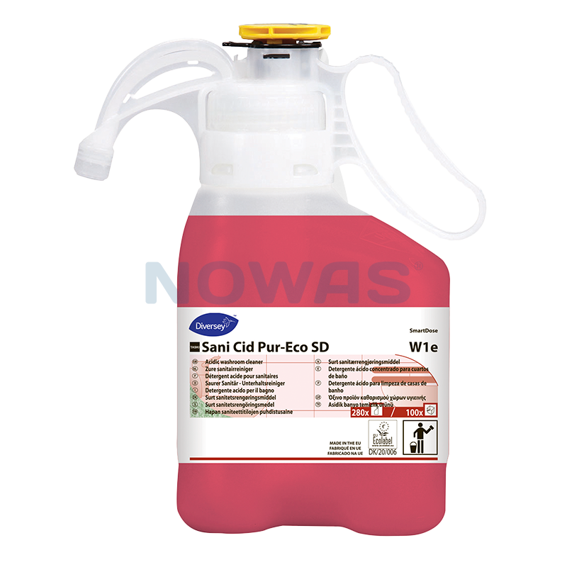TASKI Sani Cid Pur-Eco SmartDose fra Diversey, er et smart surt sanitetsrengøringsmiddei en endnu smartere beholder. Den indbyggede pumpeanordning gør nemlig, at man let og enkelt kan sikre den korrekte dosering. På den måde undgås overdosering, hvilket set ud fra både et økonomisk-, miljømæssig- samt rengøringsmæssigt perspektiv er klart at foretrække.