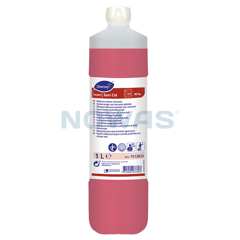 TASKI Sani Cid er et surt sanitetsrengøringsmiddel til daglig rengøring af alle overflader, der tåler syre, f.eks. emalje, porcelæn, keramiske fliser, glas m.m. Velegnet til alle vandhårdheder, inklusive hårdt vand. Den specielle formulering har en god rengøringsevne og forhindrer opbygning af kalk.