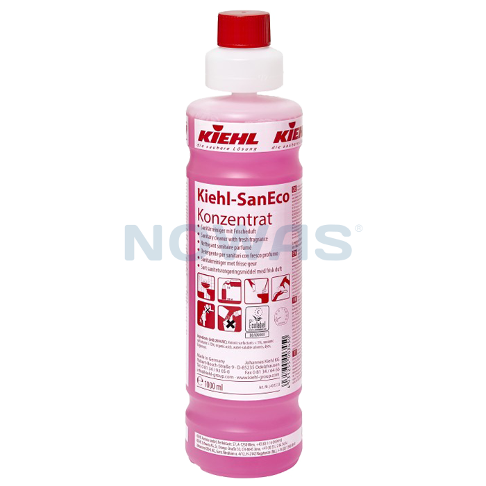 Daglig sanitetsrengøring med hurtigtvirkende rengørende komponenter. Kiehl Saneco anvendes til effektiv fjernelse af kalkaflejringer og snavs bundet hertil. Velegnet til brug på alle syre- og vandresistente overflader og materialer på sanitære områder. Kiehl Saneco er med frisk duft, og tildelt miljømærket EU Blomsten.