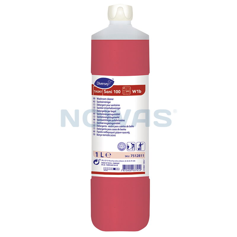 TASKI Sani 100 er et sanitetsrengøringsmiddel med parfume til daglig rengøring af alle overflader, der tåler vand. Ved brug i den anbefalede dosering er TASKI Sani 100 velegnet til rengøring af emalje, krom, porcelæn, keramiske fliser, marmor, glas, syntetiske og malede overflader, mm. Taski Sani 100 efterlader en behagelig, frisk duft. Regelmæssig brug af Taski 100 hindrer opbygning af kalk og kalksæber. Fjerner effektivt almindeligt sanitært snavs, f.eks. hudfedt, kosmetik og sæberester