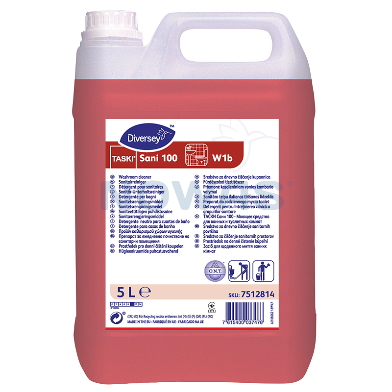 Taski Sani 100 er et sanitetsrengøringsmiddel med parfume til daglig rengøring af alle overflader, der tåler vand. Ved brug i den anbefalede dosering er Taski Sani 100 velegnet til rengøring af emalje, krom, porcelæn, keramiske fliser, marmor, glas, syntetiske og malede overflader, mm.