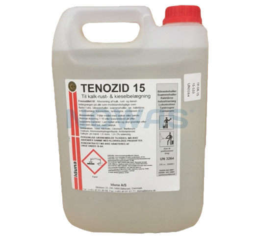 Tenozid 15 er et stærkt surt grundrensningsmiddel. Tenozid 15 et et specialmiddel, som løser mange usædvanlige opgaver, hvor andre sure produkter må give op. Især må fremhæves, at produktet udover de sædvanlige kalk/rust-fjernende egenskaber i mange tilfælde fjerner kiselbelægninger, striber på ståltanke, indtørret sæbe m.v.