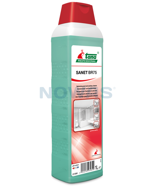 SANET BR 75 er til alle offentlige og private swimmingpools, toiletter (urinaler), bruse- og baderum. Ved anvendelse på krombelægninger som er i dårlig stand, kan der opstå farveændringer (passivering). Må ikke bruges på syrefølsomme materialer som marmor, kobber, aluminium, nylon (polyamid) osv. Fugt med masser af vand på absorberende materiale, som f.eks. sammenføjninger. Inden påføring anbefales det at påføre materialet et diskret sted for at undersøge, om det er foreneligt.