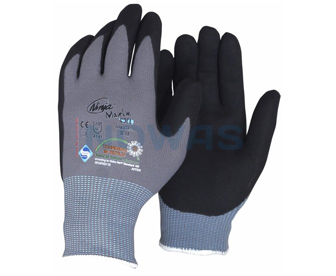 Ninja Maxim handsker er arbejdshandsker fremstillet i nylon/spandex, og sømløse med ribkrave. Ninja Maxim handsken er halvdyppet med en patenteret, unik nitril-foam belægning.
