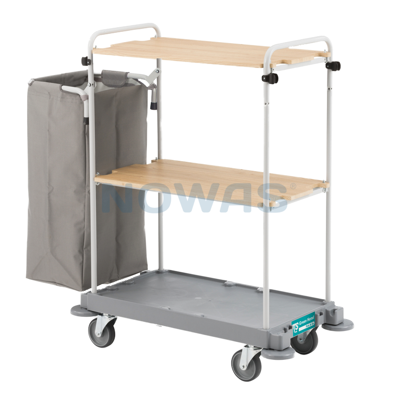 En hotelvogn i pænt design til at bære rent og beskidt linned m.m. på hoteller, eller i offentlige bygninger.