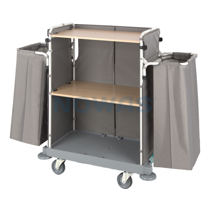 En hotelvogn i pænt design til at bære rent og beskidt linned m.m. på hoteller, eller i offentlige bygninger.