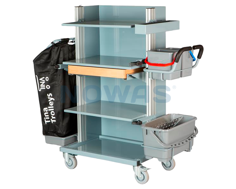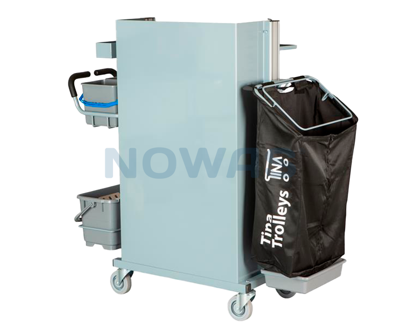 Praktisk indrettet rengøringsvogn fra Tina Trolleys, designet til hotelbranchen. Er beregnet til indendørs brug.