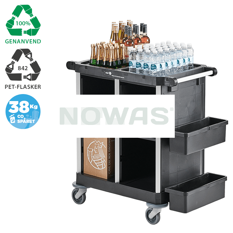 Miljøbevidst, stilren og brugervenlig servicevogn i NMFs eksklusive designlinje. Størrelse Medium. Gennemført vogn til daglig opfyldning og servicering på fx hoteller. Mange opbevaringsmuligheder til små og store ting. Udnyt pladsen maksimalt NRT 2.0 er testet til at bære 300 kg. Aluminiumskonstruktion og 2-lagsplast sikrer en levetid på min. 10 år. De store, lydsvage hjul sammen med den solide aluminiumskonstruktion får vognen til at køre ubesværet, og den er nem at styre. Det stilrene design og bæredygtige materialevalg efterlader et professionelt og miljørigtigt udtryk.