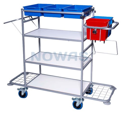 Denne vogn har plads til det hele. Linned, håndklæder samt plads til diverse opfyldning af produkter. Ligeledes har den 2 stk. 6 ltr. spande til aftørring samt holder til både affaldssæk og brugt linned. Konstrueret således at man kan komme til fra begge sider.