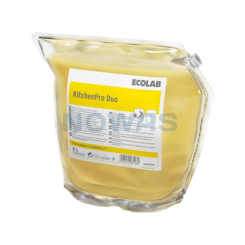 KitchenPro Duo fra Ecolab, er et universalrengøringsmiddel, der efterlader overflader rene og frie for snavs og smuds. Universalrengøringsmidlet har en høj koncentration og har farven gul. Et karton indeholder 2 x 2 ltr.