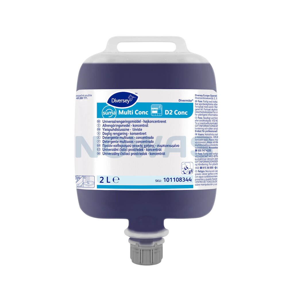 Suma Multi conc D2 conc er et højkoncentreret produkt til rengøring af hårde overflader i fødevarevirksomheder, inklusiv gulve, vægge, døre, lofter og udstyr. Suma Multi conc D2 conc er et højkoncentreret universalrengøringsmiddel, velegnet til manuel rengøring af alle overflader i et køkken. Formuleringen er en optimal sammensætning af an- og nonionisk tensider og alkali, som effektivt fjerner fedtbesmudsning og indtørrede madrester. Indhold af kalkbinder gør produktet velegnet i alle vandforhold og efterlader emner rene. Suma Multi conc D2 conc doseres korrekt gennem JohnsonDiversey Divermite dispenser.