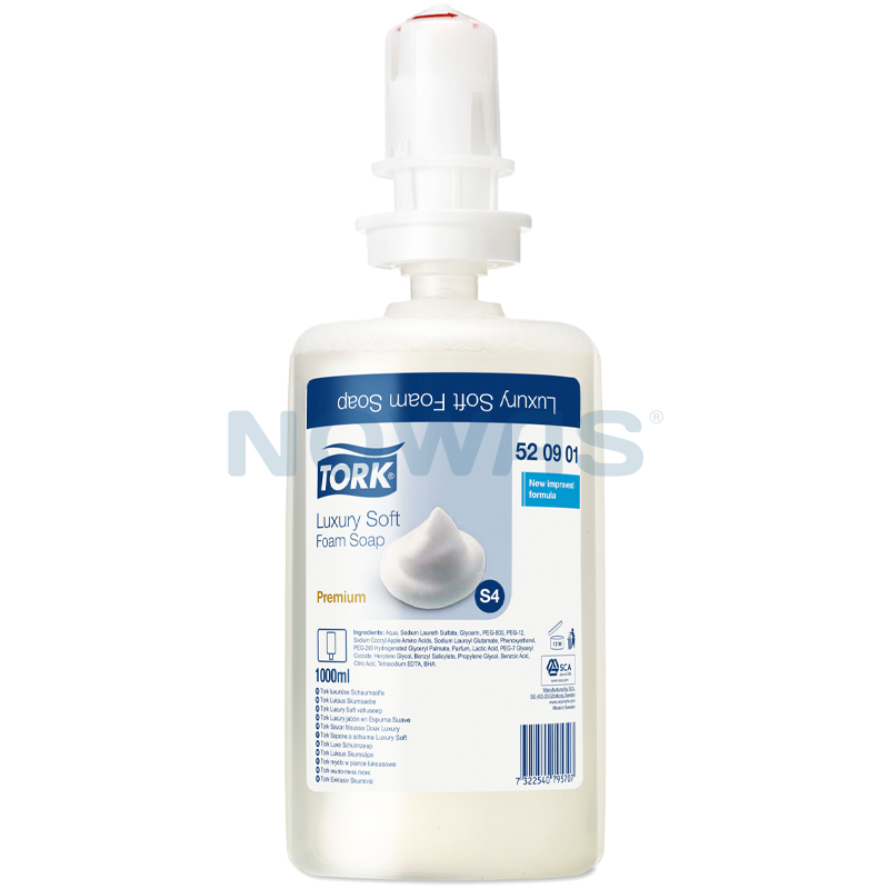 Tork 520901 er en eksklusiv skumsæbe, med milde ingredisener, som er skånsom mod huden. Produktet passer til Tork S4 dispensere, og et indhold på 1000 ml. Denne skumsæbe anbefales til brug på blandt andet gæstetoiletter, såfremt at det er vigtigt at give kunderne en kvalitetsoplevelse.
