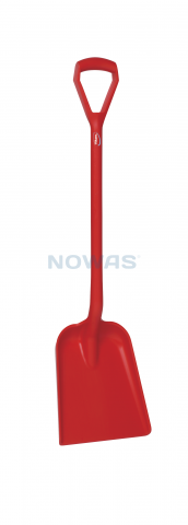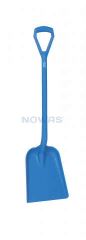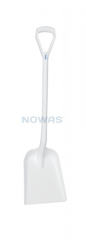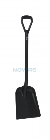 Stabil skovl med kort skaft og standard blad. Skovl i et stykke. Velegnet til brug i forbindelse med levnedsmidler. Velegnet f.eks. ved arbejde fra beholder til transportbånd i fødevareindustrien.
