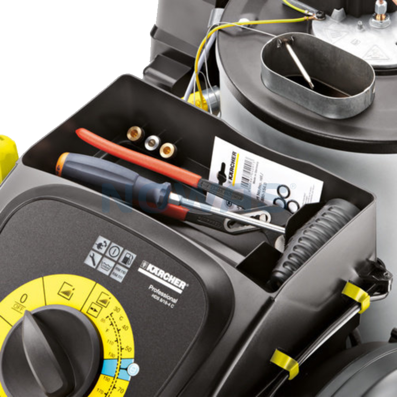 - Aflåseligt tilbehørsrum til dyser, værktøj m.m. Opbevaringskroge til elledninger og højtryksslange.