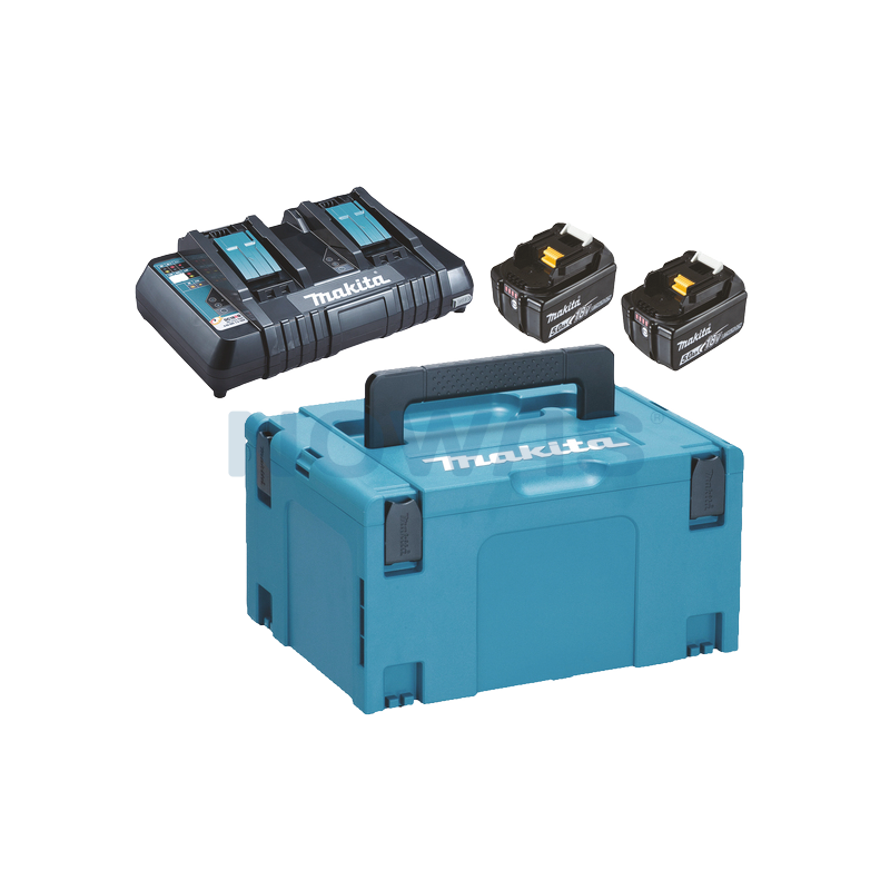 Udstyret med rengørings-kit, og leveres med batteripakke bestående af dobbelt lynlader, 2 x 18V - 5,0Ah Li-Ion batterier og MAKPAC systemkuffert str. 3.