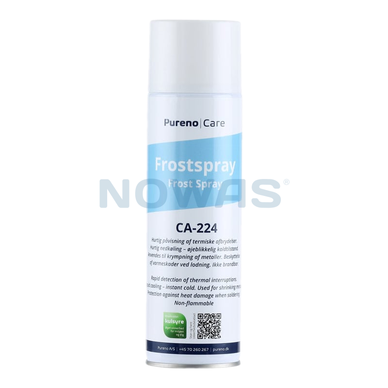 Frostspray fra Pureno anvendes til påvisning af termiske afbrydelser samt fejlfinding på trykte kredsløb. Nedkøler transistorer, modstande, dioder m.m. Kan anvendes til krympning af metaller og giver beskyttelse mod varmeskader ved lodning.