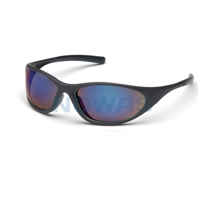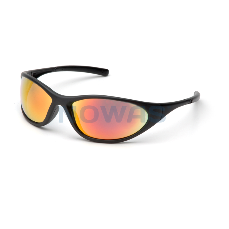 En moderne sikkerhedsbrille med sort stel og spejllinser fremstillet af slagfast polycarbonat. Linserne beskytter mod skadelige UV-stråler. Behagelig komfort med lige brillestænger med gummispidser for enden samt blød integreret næsepude.