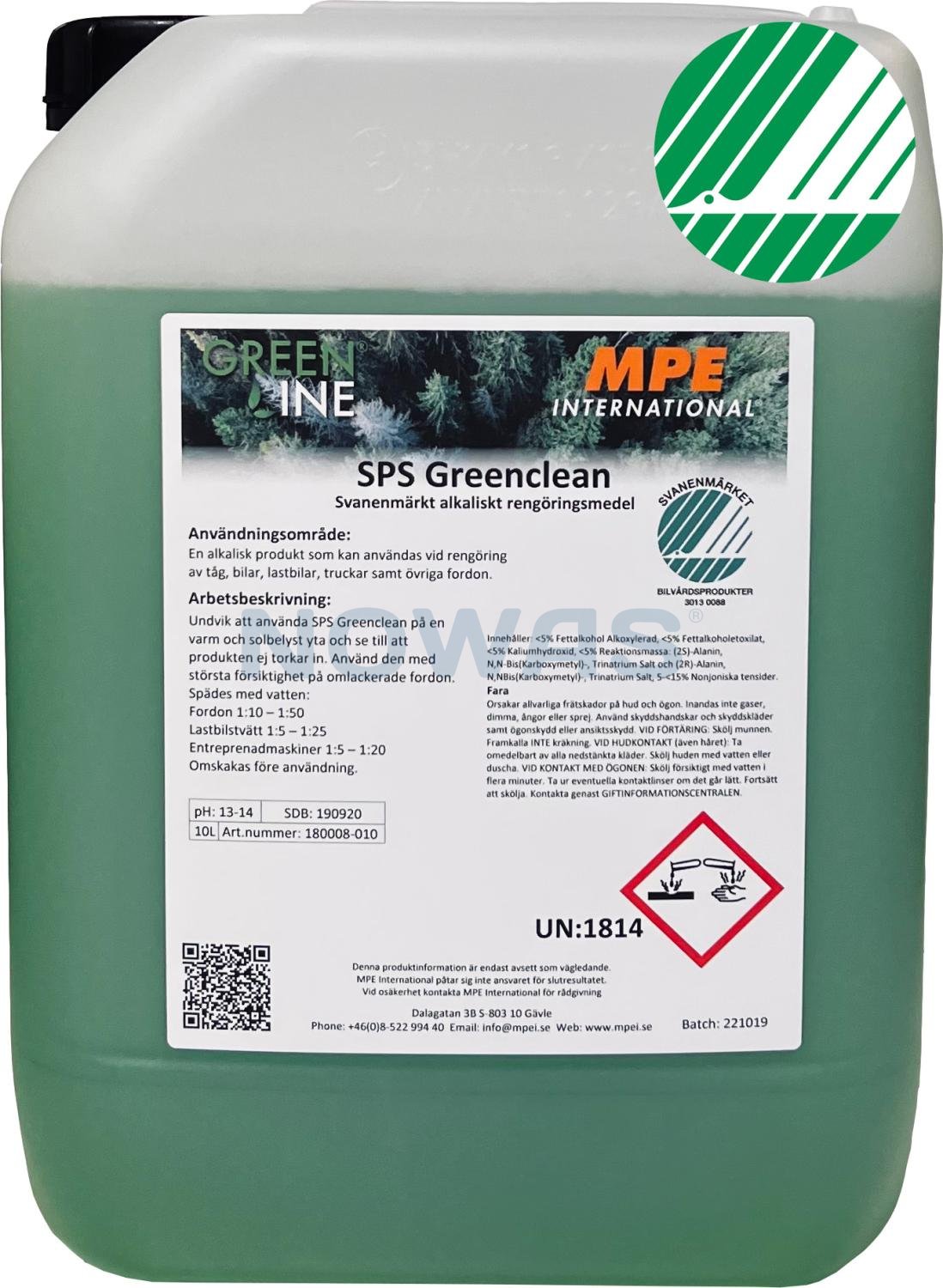 SPS Greenclean er et effektivt, miljømærket rengøringsmiddel udviklet til professionel rengøring og affedtning af køretøjer og industrielle overflader. Produktet er en del af MPE's miljøvenlige GreenLine-serie og opfylder kravene til nordiske miljømærkninger.