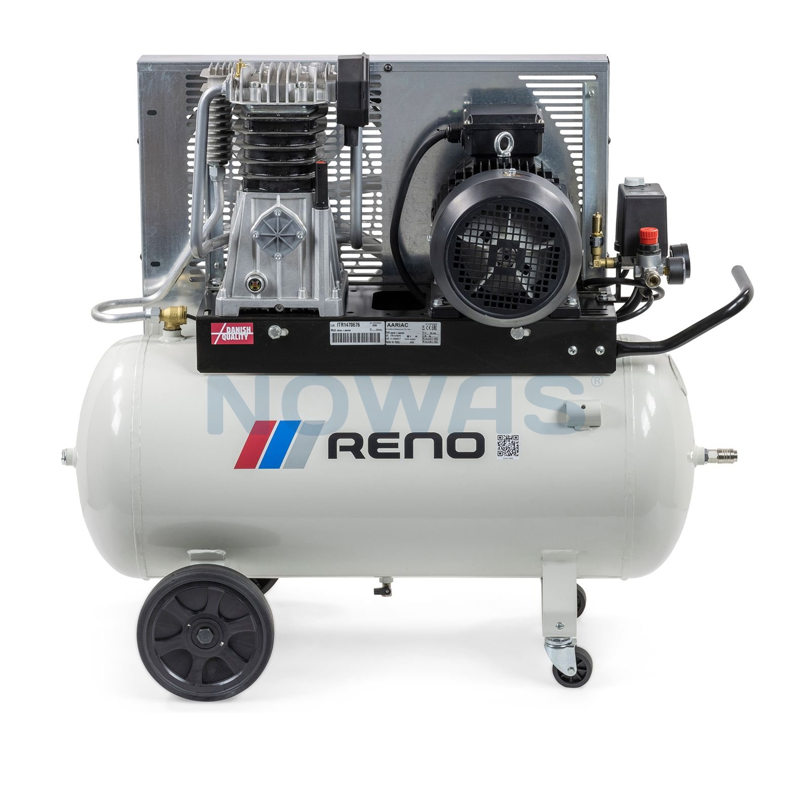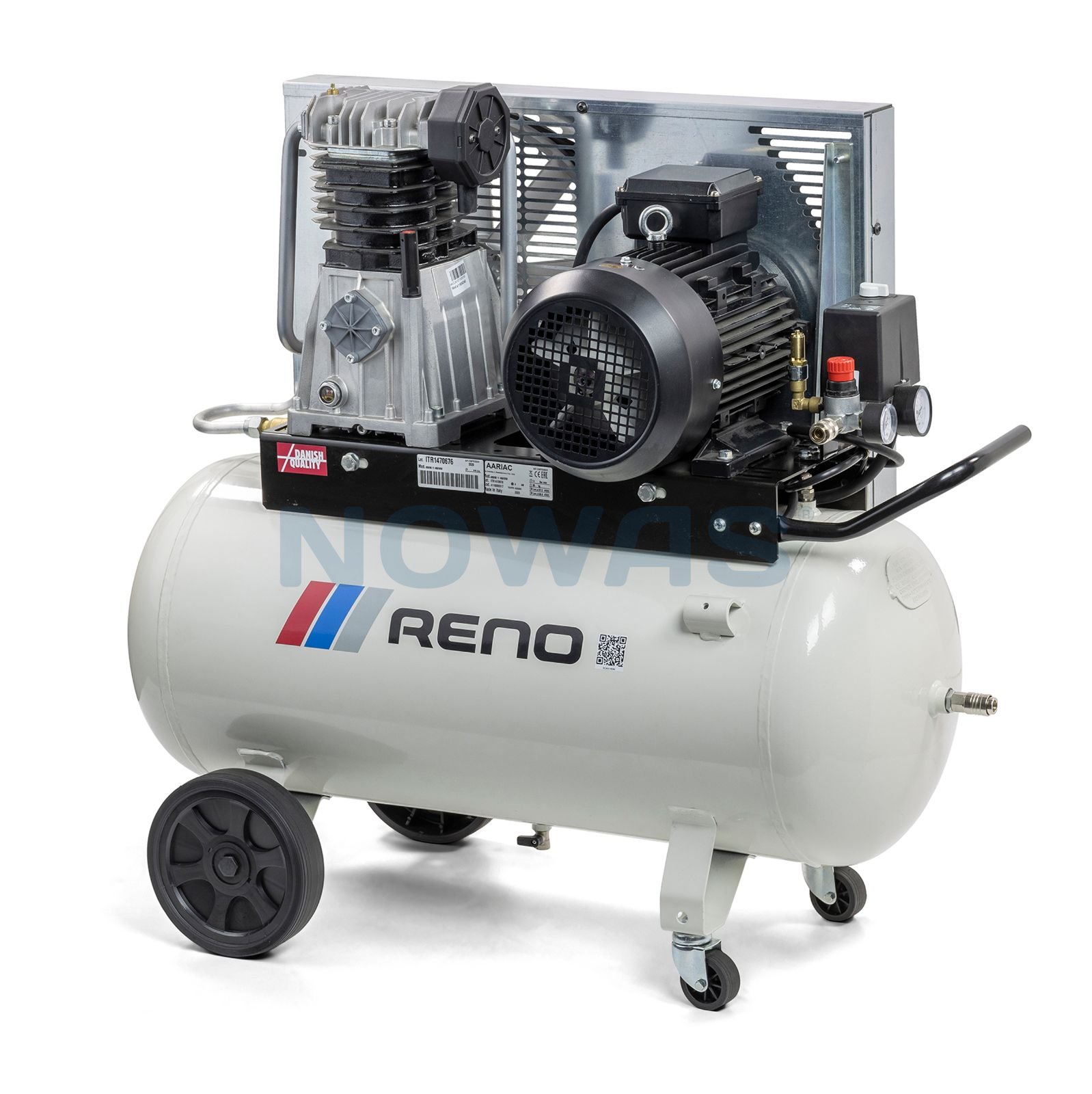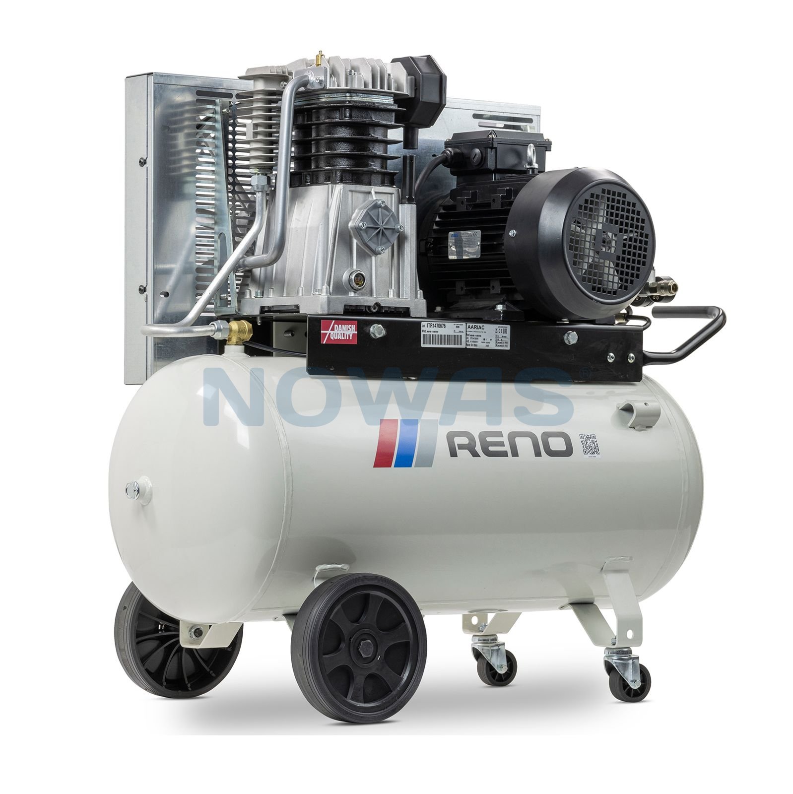 TAGS: reno kompressor stempelkompressor professionel trefaset stærk driftssikker, beholder 90 liter velegnet autoværksted klargøringsværksted mobil robuste hjul robust smart håndtag flyttes