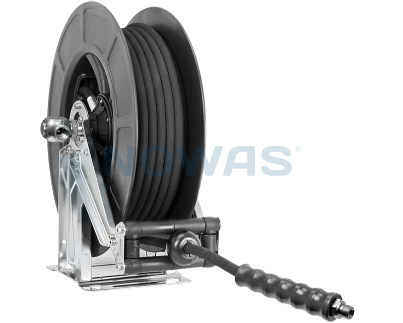 Slangehjul til højtryk inkl. slange. Automatisk indrulning og kompakt opbevaring af slangen.