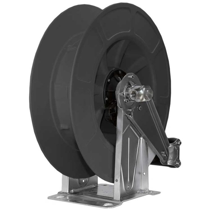Robust og driftssikker slangeopruller til professionel brug, udført i en kombination af rustfrit stål og slagfast sort plast.