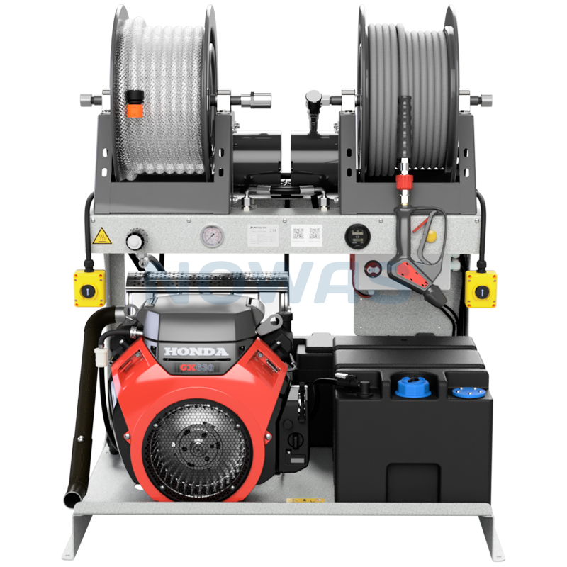 Komplet højtryksrenser opbygget på solid stålramme. Komplet styring med forberedt tørløbssikring hvilket sikrer at der er tilstrækkelig væske i systemet, og dermed forhindrer at pumpen kører tør.