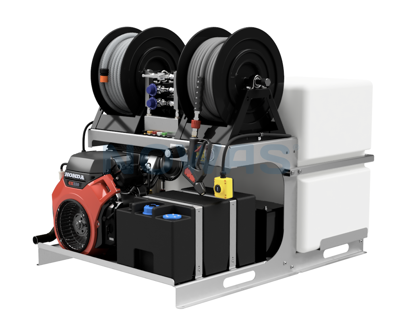Komplet højtryksrenser opbygget på solid rustfri stålramme, inklusiv 350 liters sektionsopdelt vandtank.