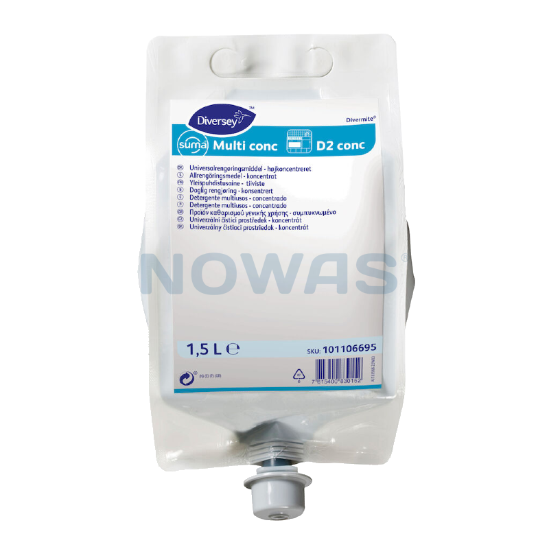 Suma Multi conc D2 conc er et højkoncentreret universalrengøringsmiddel, velegnet til manuel rengøring af alle overflader i et køkken. Formuleringen er en optimal sammensætning af an- og nonionisk tensider og alkali, som effektivt fjerner fedtbesmudsning og indtørrede madrester. Indhold af kalkbinder gør produktet velegnet i alle vandforhold og efterlader emner rene. Suma Multi conc D2 conc doseres korrekt gennem Diversey Divermite dispenser.