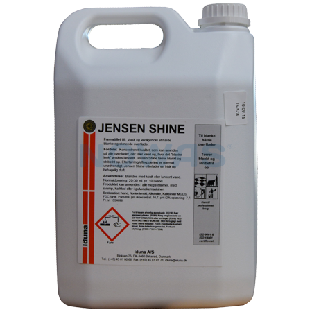 Rengøringsmiddel i koncentreret kvalitet. Jensen Shine anvendes til rengøring af alle overflader, der tåler vand og, hvor det ”blanke look” ønskes bevaret.