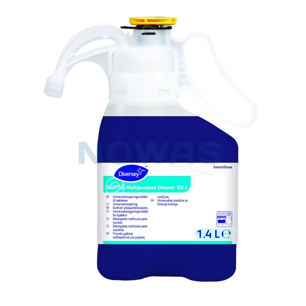 Suma SmartDose Multipurpose Cleaner D2.3 er et højkoncentreret universal rengøringsmiddel, som er velegnet til manuel rengøring af overflader I køkkenet. Det er en optimal blanding af kationiske og nonioniske tensider, som gør at produktet er effektivt til fjernelse af fedt og indtørrede fødevarer.
