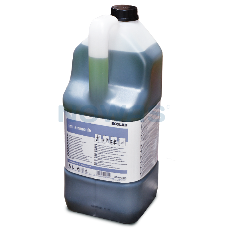 Ecolab Imi ammonia er et flydende alkalisk rengøringsmiddel. Skånsomt og effektivt. Fjerner også olie- og fedt-pletter. Behagelig duft. Særdeles velegnet til hovedrengøring.