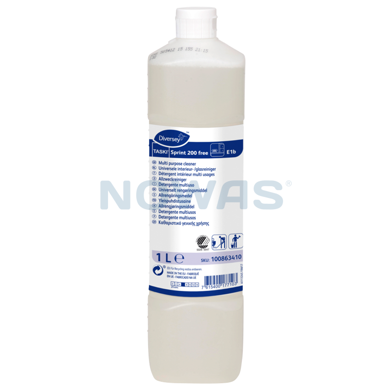 Taski Sprint 200 Free er et universelt rengøringsmiddel til daglig brug på alle overflader, der tåler vand. Et universelt rengøringsmiddel uden farve eller parfume til daglig rengøring af alle overflader, der tåler vand, inklusive vinduer, spejle, glaseret keramik og plastikoverflader. Sprint 200 Free fjerner effektivt fingeraftryk og andre pletter fra let klæbende og fedtbundet snavs. Produktet tørrer hurtigt uden at efterlade striber. Sprint 200 Free er også velegnet til gulvvaskemaskiner, skuremaskiner og manuel vask. Opfylder svanemærkekriterierne for rengøringsmidler.