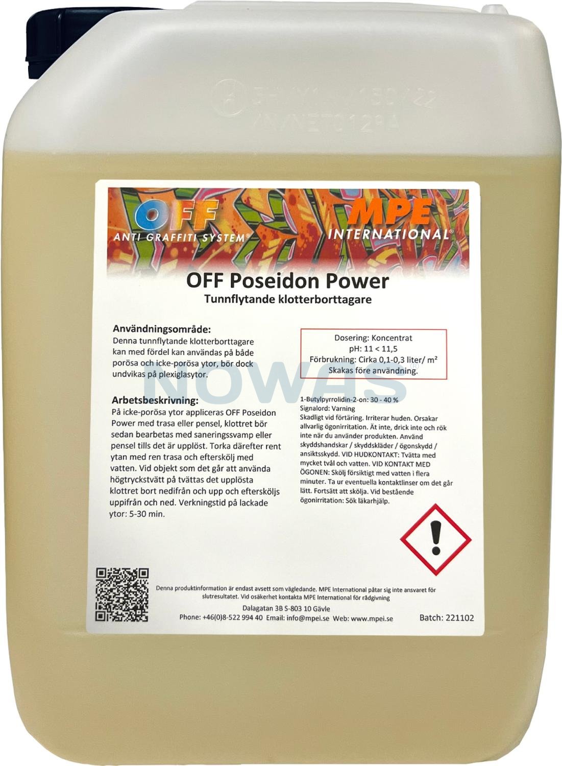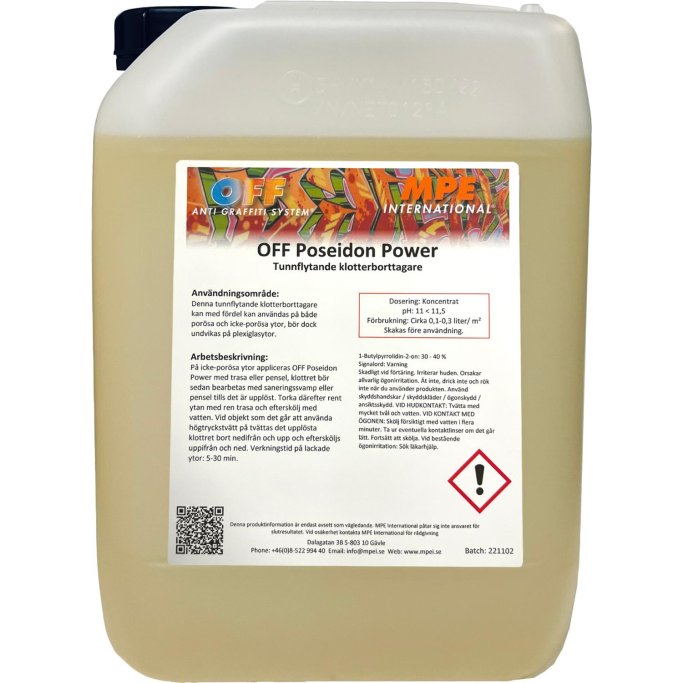 OFF Poseidon Power er en kraftfuld, flydende graffitifjerner udviklet til effektiv sanering af graffiti på ikke-porøse overflader såsom metal, glas, lakerede flader og lignende hårde materialer.