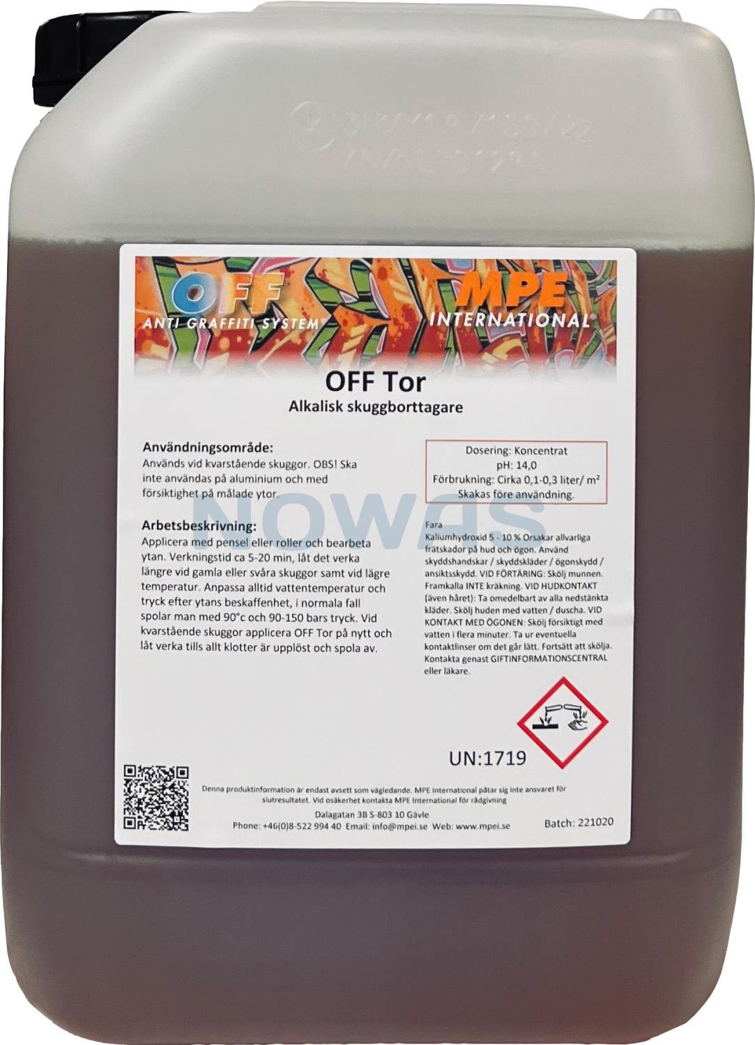 OFF Tor Skuggefjerner er en kraftig, alkalisk specialrens udviklet til effektiv fjernelse af restskygger efter graffiti. Produktet anvendes typisk som sidste trin i graffiti-sanering, hvor almindelige graffitifjernere ikke har fjernet alle spor.