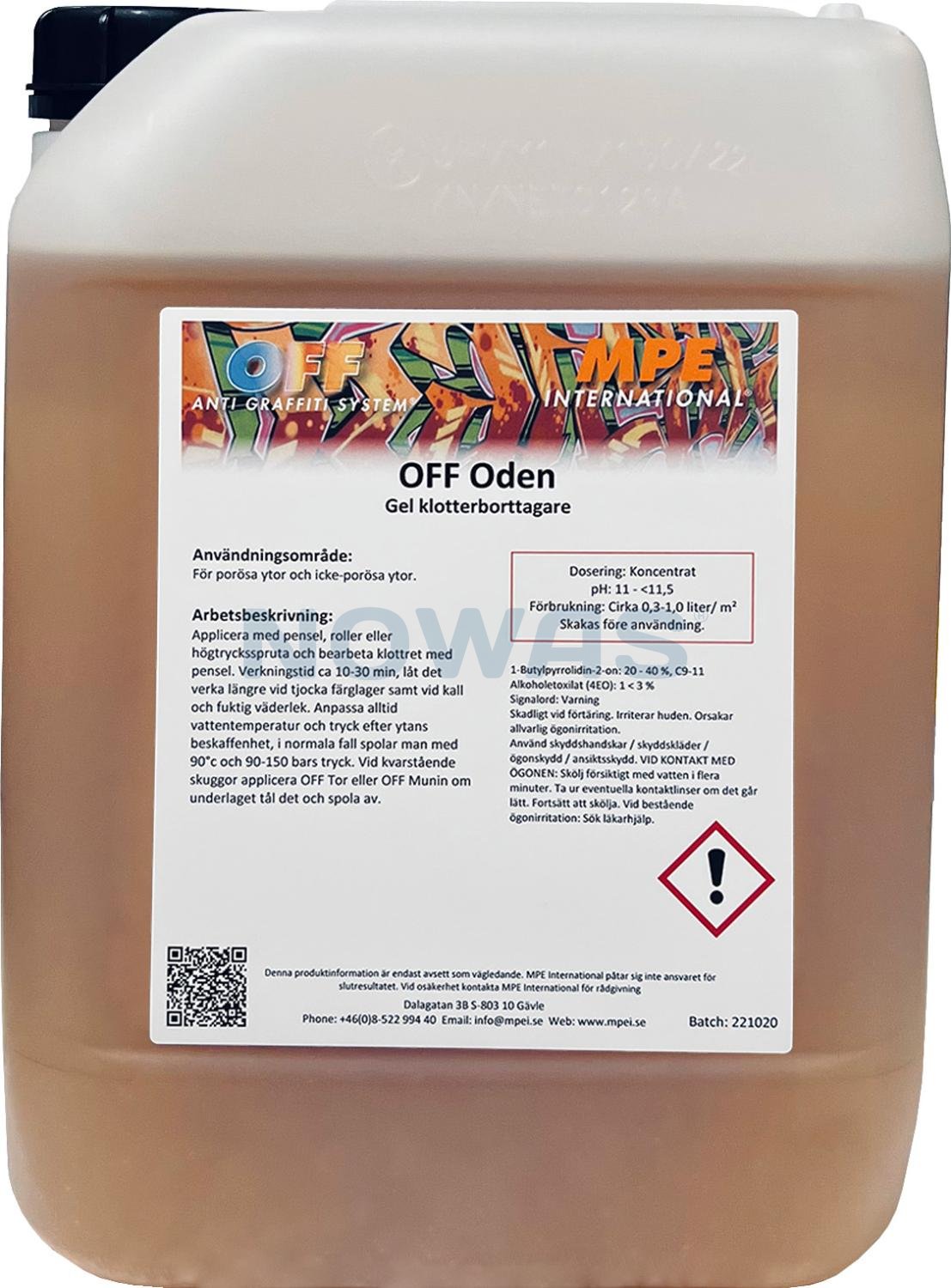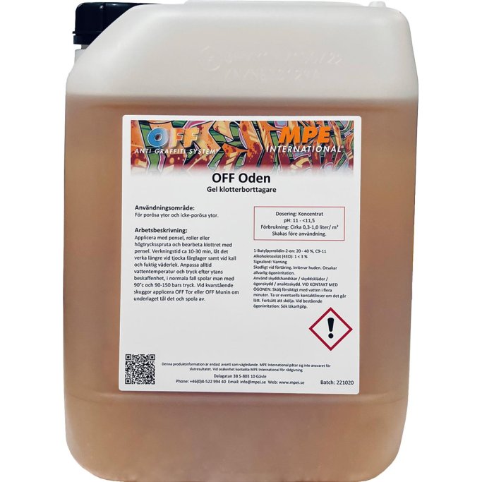 OFF Oden er en effektiv, gelbaseret graffitifjerner, udviklet til hurtig og grundig fjernelse af både spraymaling, tusch og andre typer graffiti. Den fortykkede formulering sikrer optimal vedhæftning til overfladen, hvilket giver længere virketid og bedre rengøringsresultater - selv på lodrette overflader.