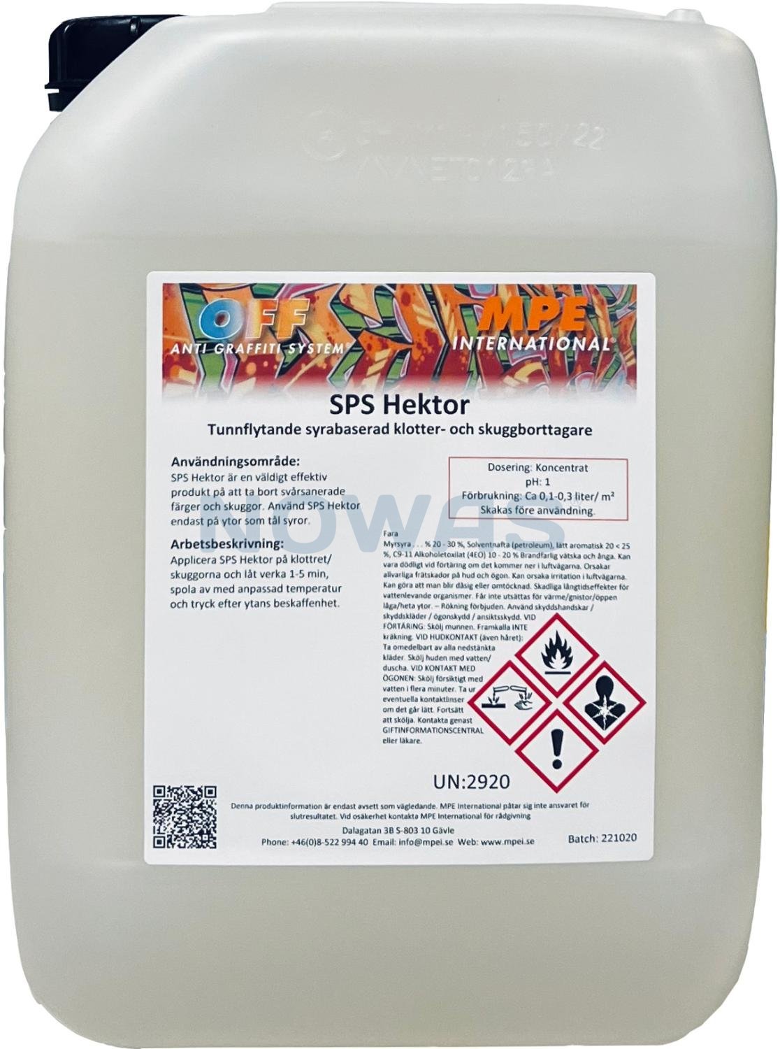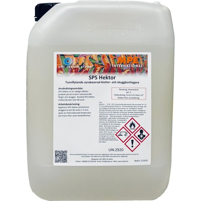 SPS Hektor er en meget kraftig, tyndtflydende graffitifjerner udviklet til fjernelse af genstridig graffiti og skygger, hvor almindelige produkter ikke er tilstrækkelig.