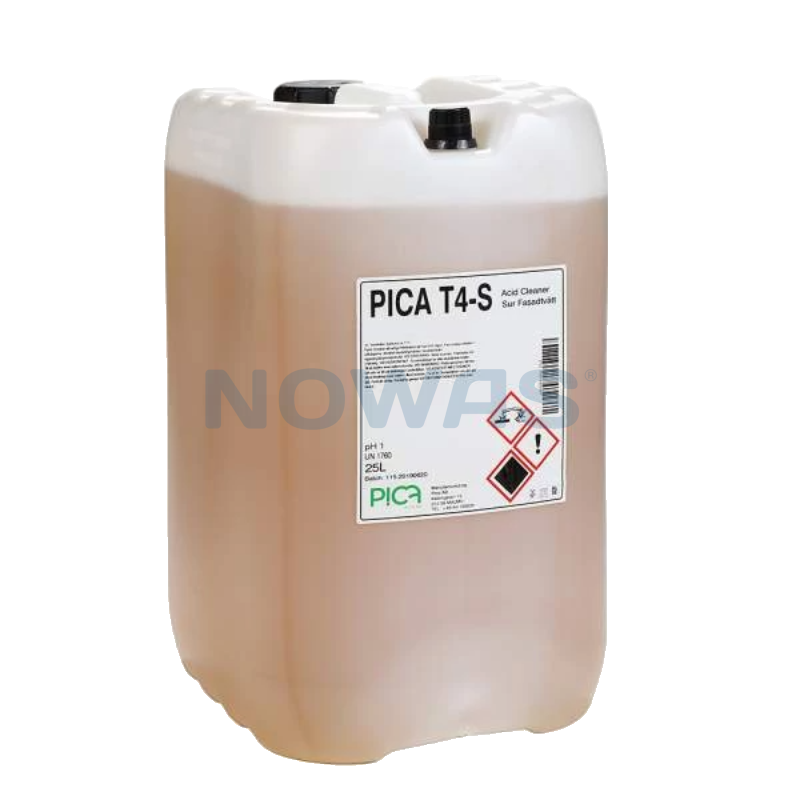 Pica T4-S er et syrebaseret facaderengøringsmiddel, som er særligt velegnet til rengøring og pletfjernelse på mineralske overflader som beton, tegl og natursten. Pica T4-S fjerner effektivt kalk, rustpletter og oxider af forskellige metaller. Vær dog forsigtig med at bruge Pica T4-S på sarte overflader som marmor. Produktet bør heller ikke bruges på metal, plast, plexiglas eller andre ikke-mineralske overflader.