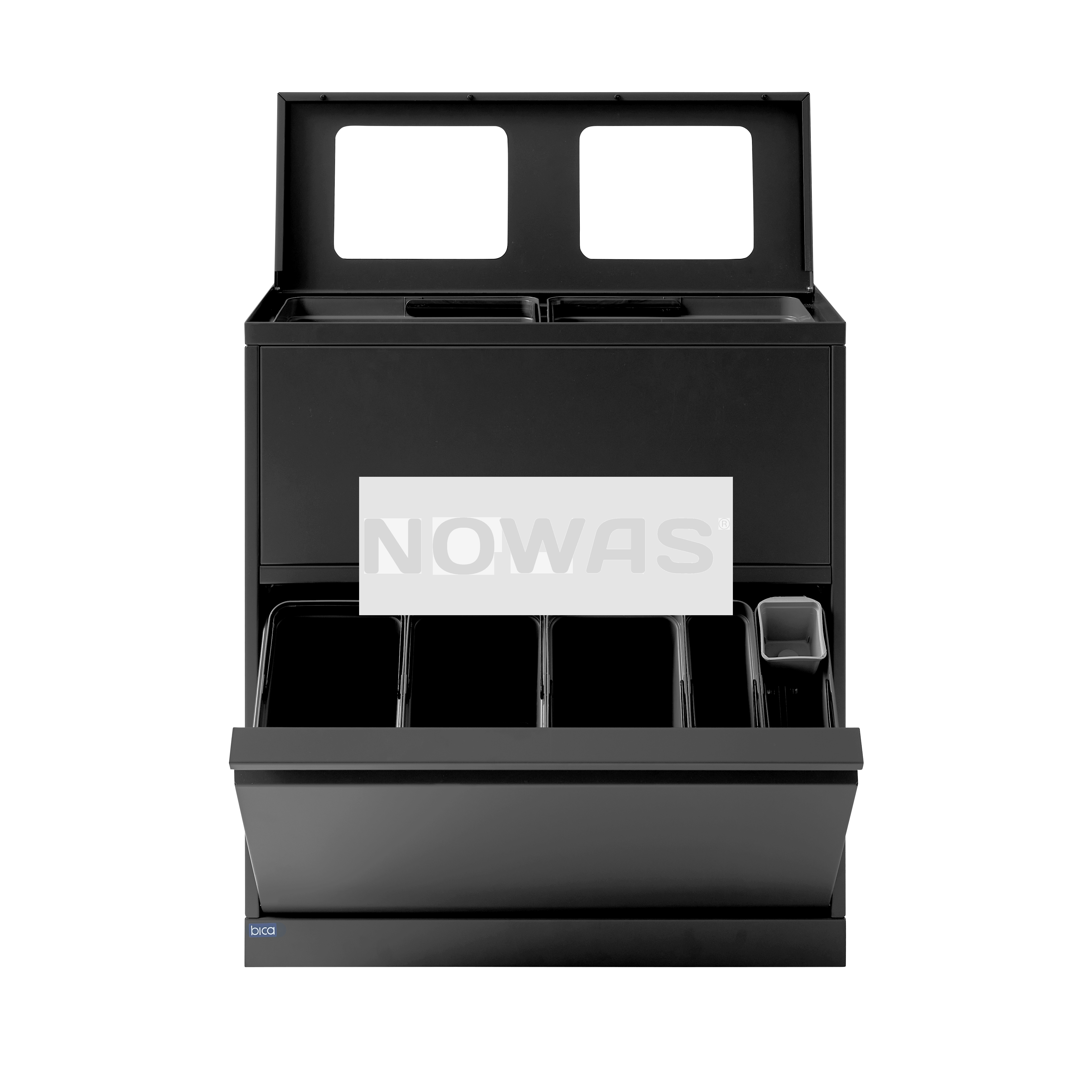 Fleksibelt affaldssystem fra Bica sikrer nem og brugervenlig affaldssortering på arbejdspladsen. Affaldssystemet er designet med 2 åbne indkast og med en skuffe skabt til brug af inderbeholdere. Der medfølger inderbeholdere efter ønske og kan dermed tilpasses efter behov, så man i alt kan opnå sortering i 11 enheder. Den samlede volumen skal blot gå op i 40 liter i både den øverste og nederste del. Fx 20 + 20 liter eller 15 + 15 + 10 liter. Bica Model 880 er absolut én af vores mest populære modeller.